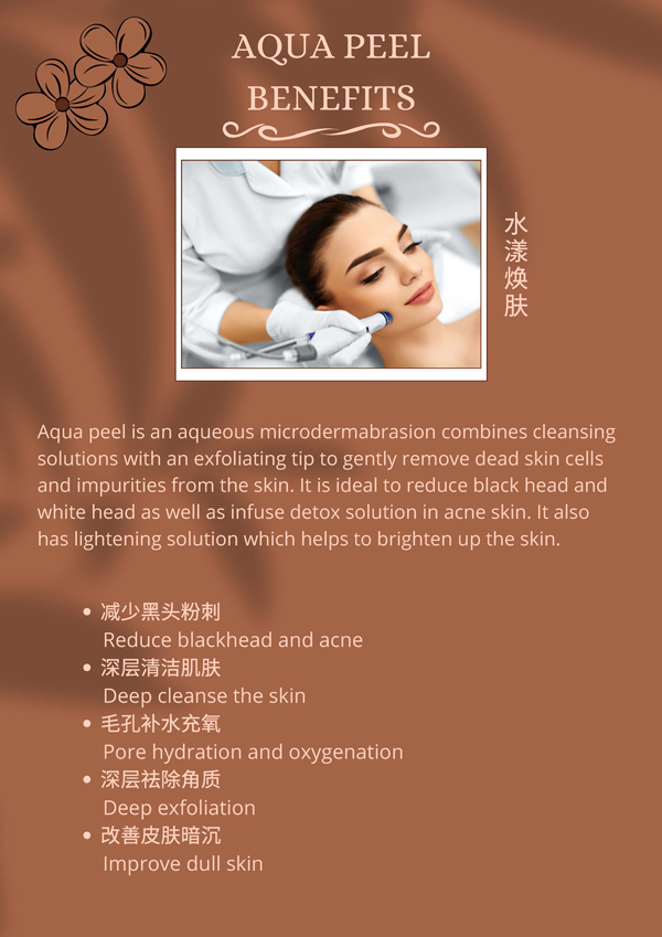 Aqua peel is an aqueous microdermabrasion combines cleansing solutions with an exfoliating tip to gently remove dead skin cells and impurities from the skin. It is ideal to reduce black head and white head as well as infuse detox solution in acne skin. It also has lightening solution which helps to brighten up the skin.