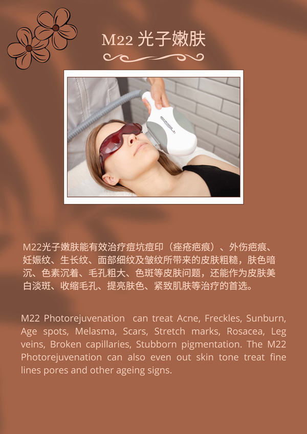 M22 Photorejuvenation can treat Acne, Freckles, Sunburn, Age spots, Melasma, Scars, Stretch marks, Rosacea, Leg veins, Broken capillaries, Stubborn pigmentation. The M22 Photorejuvenation can also even out skin tone treat fine lines pores and other ageing signs.